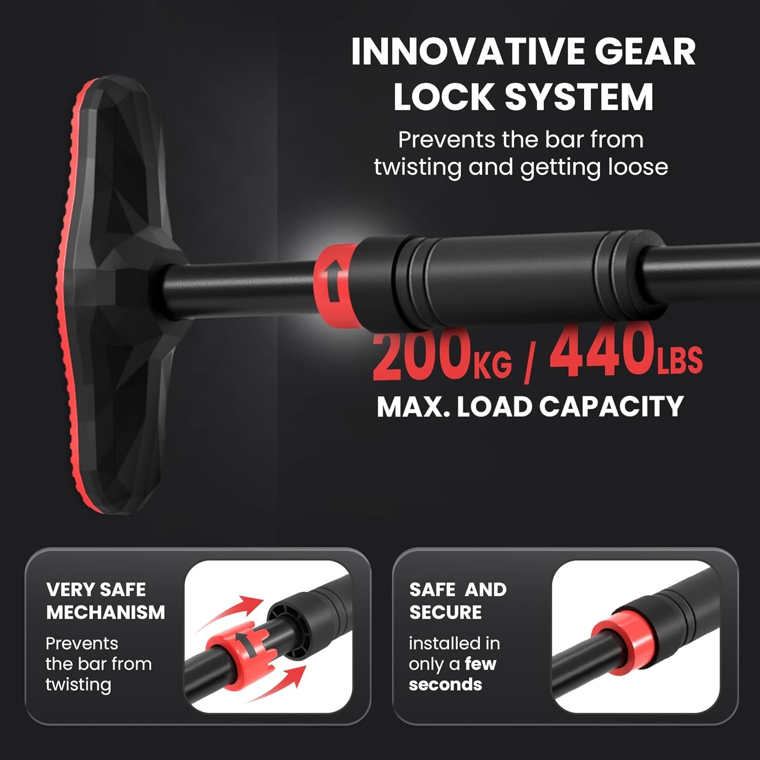 No need for drilling or damage — the No-Screw Locking System ensures a strong, stable hold. Made from heavy-duty steel with anti-slip foam grips, this bar supports intense upper body training safely.